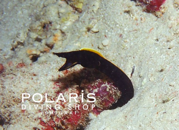 ハナヒゲウツボの幼魚です。まだ健在でしたし、まだ黒い幼魚の色でした。