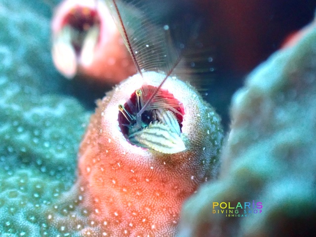 かまくらに入っているみたいなカンザシヤドカリは半分だけ顔を出して触覚に引っかかる餌を