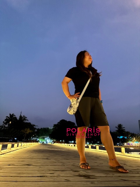 ライトアップされた桟橋で買い物前にはしゃいでみたり(写真は現地スタッフのえみちゃん)